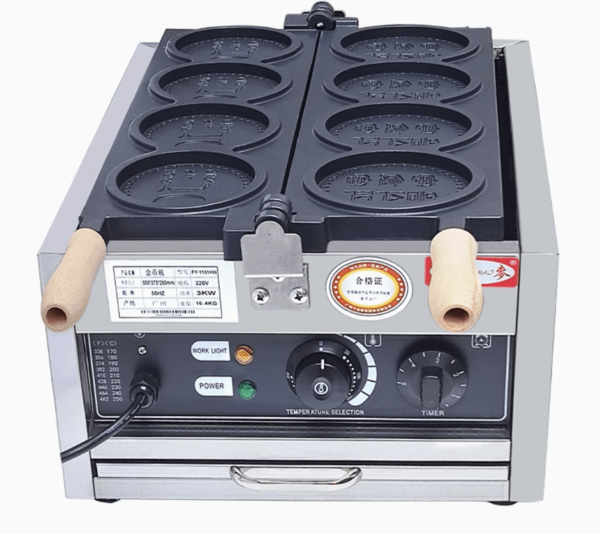 Đây là chiếc máy đồng tiền có 4 khuôn dùng để nướng bánh. Với số lượng khuôn nhiều nên sẽ có ra một lúc nhiều bánh đồng xu hơn so với loại 3 khuôn. Đặc điểm cấu tạo của dòng máy này như sau:
