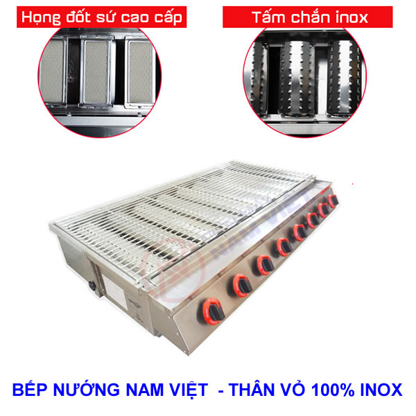 Bếp nướng gas 6 họng đốt dài do Inox Nam Việt sản xuất dày dặn hơn các bếp nướng thông thường trên thị trường với trọng lượng bếp là 18.5 kg