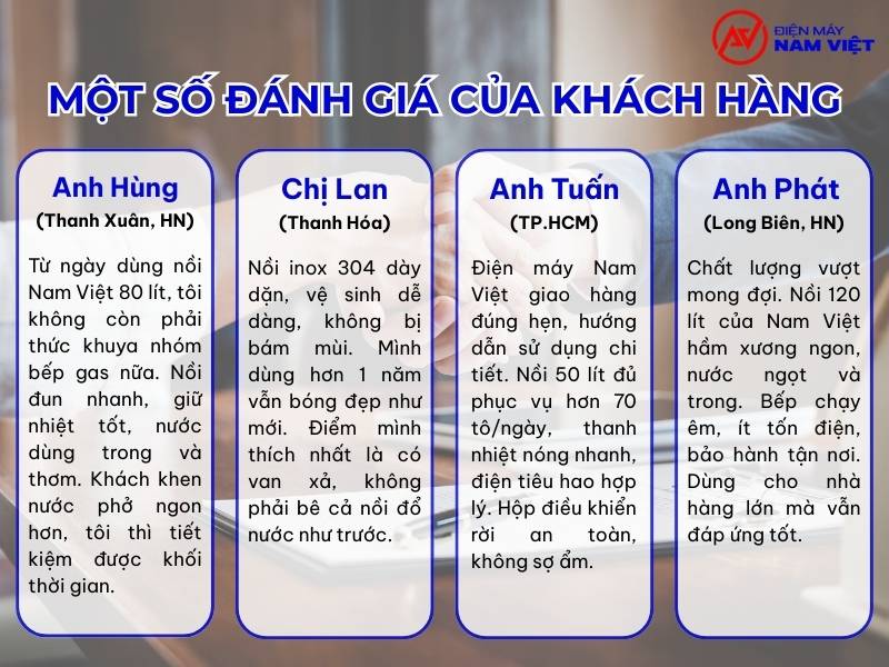 Nhiều chủ quán phở, bún, hủ tiếu đã bày tỏ sự hài lòng đặc biệt với nồi phở điện Nam Việt. Họ cho chia sẻ nồi không chỉ giúp tiết kiệm đáng kể thời gian nấu, mà còn đảm bảo hương vị nước dùng vẫn thơm ngon, đậm đà.